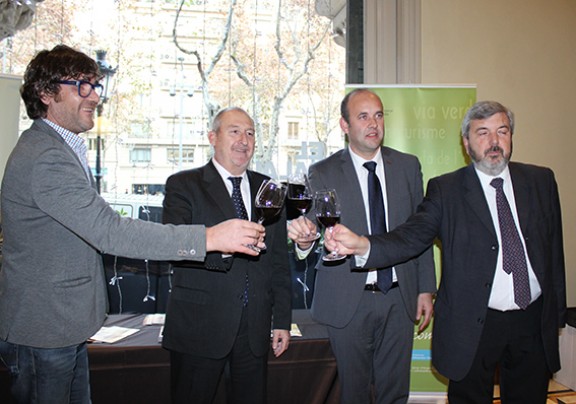 Membres de la comitiva, d'esquerre a dreta: Joan Batiste Arrufí, president del Consell Regulador de la Denominació d'Origen Terra Alta, Joan Aregio i Navarro, secretari d'Ocupació i Relacions Laborals del Departament d'Empresa i Ocupació de la Generalitat de Catalunya, Carles Luz i Muñoz, president del Consell Comarcal de la Terra Alta i alcalde de Gandesa, i Joan J. Malràs i Pascual, alcalde de Prat de Comte i diputat de la Diputació de Tarragona.