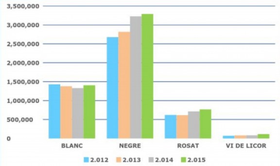 Per tipus de vi, el negre continua sent la varietat més venuda amb 3’2 milions d’ampolles el 2015, amb un increment del 2% respecte a l’any anterior. El vi blanc es manté al voltant de les 1’4 milions d’ampolles venudes, mentre que el vi rosat arriba a les 767.400 unitats, un 8% més que el 2014. Les vendes de vins dolços són les que experimenten un major creixement amb un 39% i sobrepassen per primer cop les 100.000 ampolles venudes.