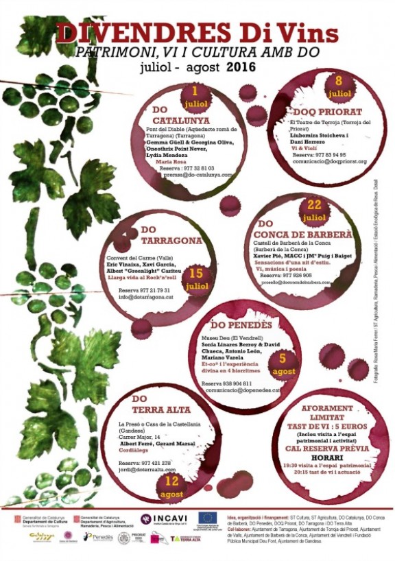Sis denominacions d’origen vinícoles del Camp de Tarragona i les Terres de l’Ebre -la DO Tarragona, la DO Penedès, la DO Conca de Barberà la DOQ Priorat, la DO Terra Alta, així com la DO Catalunya-, juntament amb els Serveis Territorials de Cultura al Camp de Tarragona i els Serveis Territorials d’Agricultura de la Generalitat i l’INCAVI, s’han unit de nou en la tercera edició dels Divendres DiVins, una iniciativa que es portarà a terme enguany des del divendres 1 de juliol fins al divendres 12 d’agost.