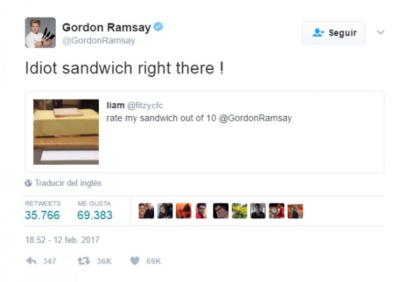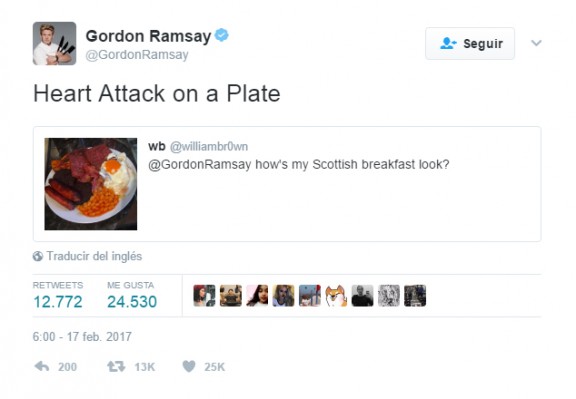1- En aquesta piulada, per exemple, un usuari li demana què en pensa del seu esmorzar escocès. Ramsay, ras i curt respon: "un atac de cor en un plat." Però la resposta tampoc es fa esperar. "Gordon Ramsay, m'ho agafaré com un compliment, gràcies germà!"