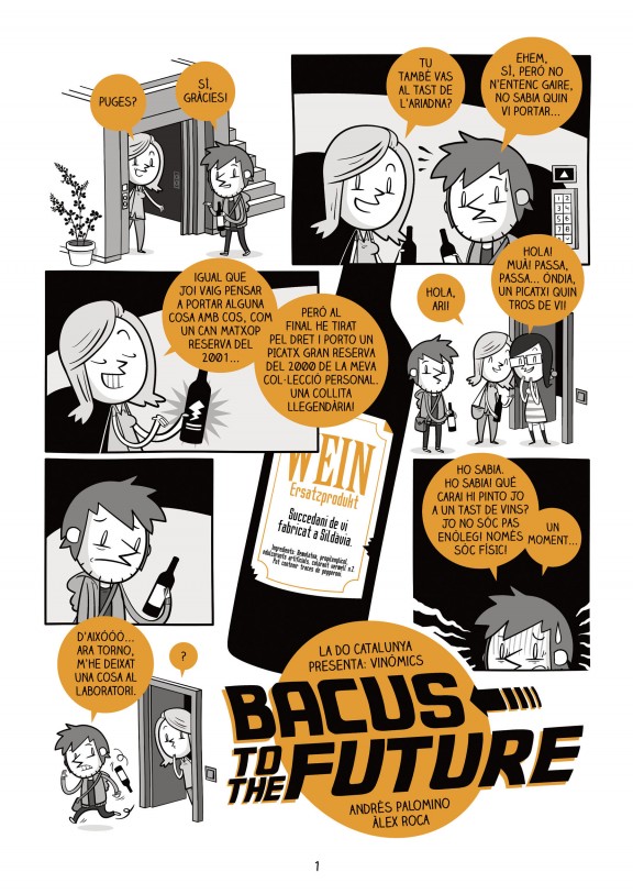 Bacus to the Future, signada pel duo Andrés Palomino (el guionista) i Àlex S. Roca (l’il·lustrador), és una historieta gràfica que, no només marida vi i còmic, sinó que aquesta vegada juga també amb els referents cinematogràfics de tota una generació. I és que aquest Vinòmic és també un homenatge a la mítica pel·lícula que ja als anys 80 ens feia viatjar pel temps i somiar amb un futur amb cotxes voladors.