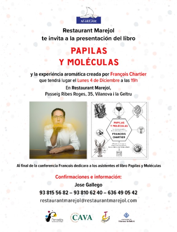 El 4 de desembre a les 7 del vespre, el restaurant El Marejol de Vilanova i la Geltrú acollirà el primer tast dirigit pel creador de la sommelieria molecular, François Chartier, al Penedès. El canadenc, que resideix a Barcelona des de fa poc temps, presentarà el seu llibre “Papilas y Moléculas” en què explica una nova ciència aromàtica a través d’un anàlisi profund de les molècules dels aliments. Durant el tast es degustaran vins de la DO Penedès dels cellers Jean Leon, Heretat Montrubí, Alemany i Corrió, Mas Candí i Hospital de Sitges.