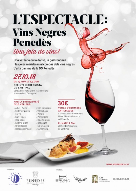 Sota el títol “L’ESPECTACLE: Vins Negres Penedès... Una joia de vins!”, l’esdeveniment organitzat pel restaurant El Gat Blau i la DO Penedès, té l’objectiu d’acostar l’excel·lència dels vins de la denominació d’origen al consumidor final barceloní. L’esdeveniment se celebrarà el proper 27 d’octubre, de 7 del vespre a 11 de la nit, al Recinte Modernista de Sant Pau de Barcelona.