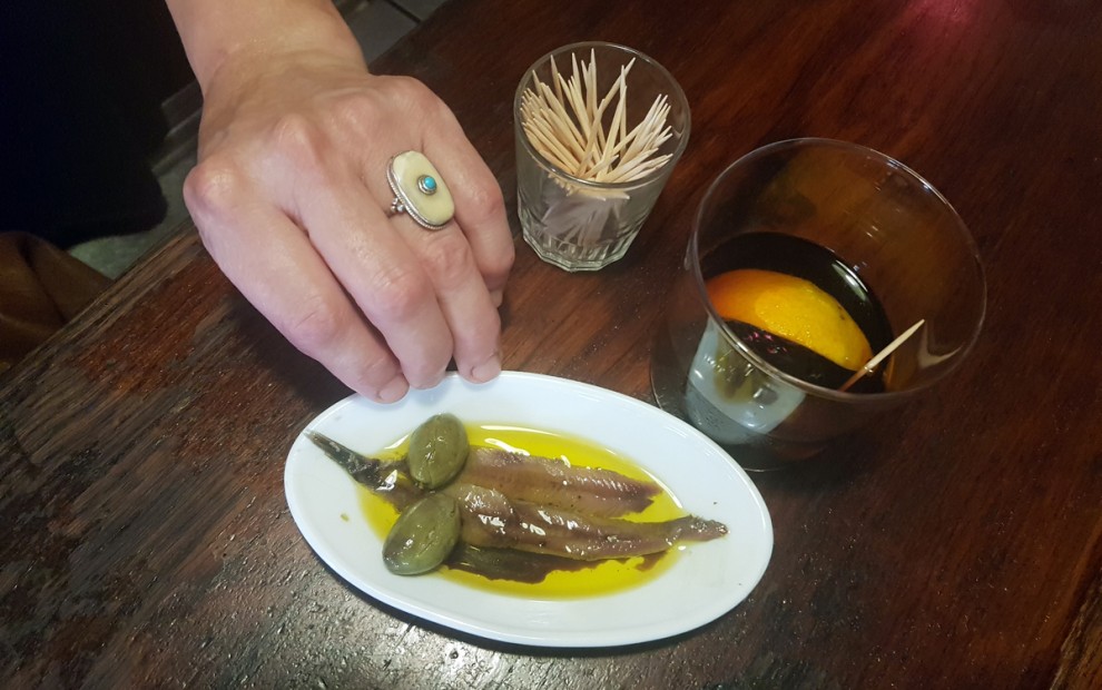 L'anxova la vincula amb la història del local, que havia estat la bodega Vilaseca, nascuda al voltant dels anys 1930. L'ara propietària del negoci rememora que hi havia qui aparcava fins i tot en segona i tercera fila per menjar anxoves, i també havia estat un lloc on es tancaven tractes de la compravenda d'antiquaris dels Encants Vells. Aquest mercat, els orígens del qual es remunten al segle XIII, es va traslladar el 2013 a un nou edifici icònic a l'altre costat de les Glòries. La plaça s'ha convertit en un dels centres neuràlgics d'obres de la capital catalana i arriba a fer frontera.