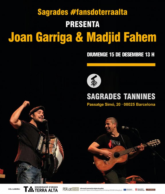 Aquest diumenge 15 de desembre, a les 13h, el local s’omplirà de la música i l’energia del duet format per Joan Garriga (La Troba Kung-Fú) i Madjid Fahem (Manu Chao), una formació musical que es va gestar als bars de Barcelona i que segur faran ballar a tots aquells que s’apropin al local que Sagrades Tannines tenen al costat de la Sagrada Família de Barcelona.