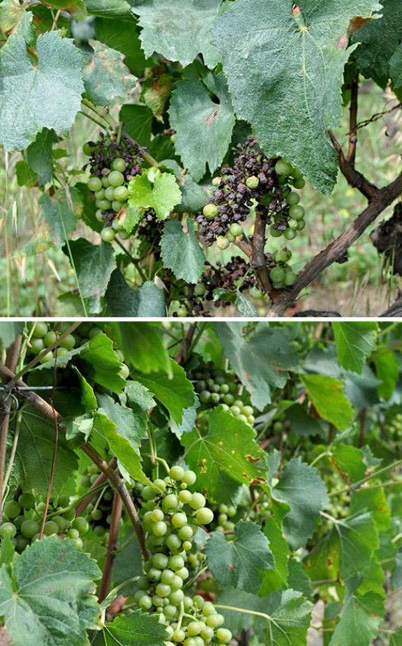 Chardonnay en condicions òptimes i chardonnay amb míldiu. Foto: Albet i Noya