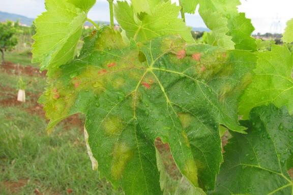 La propagació del míldiu es detecta per unes taques a les fulles. Foto: Estació d'Avisos de Vilafranca del Penedès