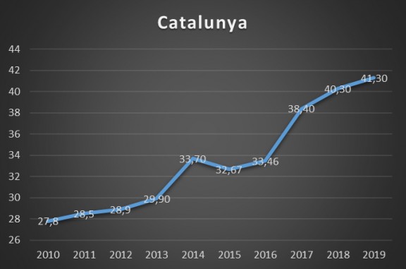 En els darrers 9 anys, a més, la tendència ha estat a l’alça, amb un increment de fins a 14 punts: el consum al 2010 era de 27,8% i, ara, del 41,3%. Al 2019, doncs, de cada 10 ampolles de vi que s’han consumit a Catalunya, 4 han estat d’alguna DO catalana.