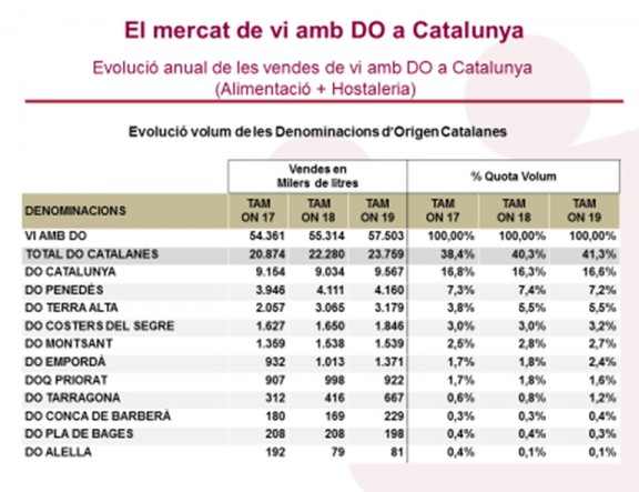 D’entre les Denominacions d’Origen catalanes, la DO Catalunya té el 16,6% del mercat, seguida per la DO Penedès amb un 7,2% i la DO Terra Alta amb un 5,5%. Pel que fa el valor, incrementa en totes les Denominacions d’Origen del Vi, una dada molt positiva que mostra el reconeixement cap al vi català amb DO.