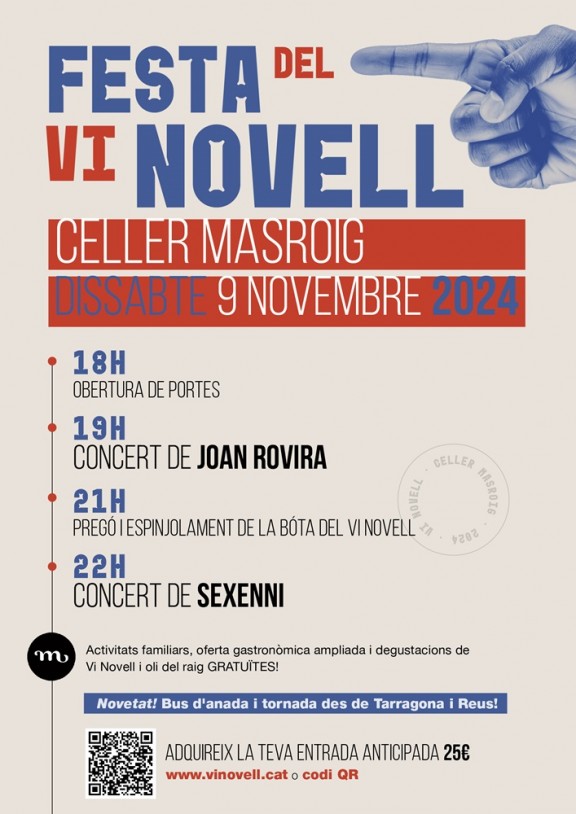 La Festa del Vi Novell del Celler Masroig, pioner en la recuperació d’aquesta tradició, catalana torna el 9 de novembre amb novetats destacades i un cartell ampliat, que inclou dos padrins: els artistes Joan Rovira i Sexenni.