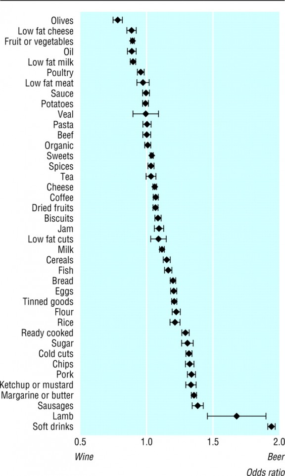 Resultats: Els compradors de vins van comprar més olives, fruites i verdures, aus de corral, oli i formatge, llet i carn baixa en greix que els compradors de cervesa. Els compradors de cervesa van comprar més plats preparats, sucre, embotits, patates fregides, porc, salsitxes, xai i refrescos que els compradors de vi.