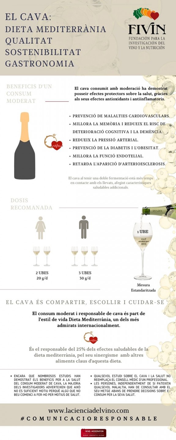 El vi i el Cava, a més dels seus continguts en alcohol, tenen altres components bioactius, que els hi donen unes característiques especials i que els diferencien d'altres tipus de begudes. El seu consum ha de considerar-se en el context d'un patró de consum, dels hàbits alimentaris i l'estil de vida, ja que els efectes poden ser diferents si es consumeix només o amb els menjars o com un component d'una dieta saludable com la mediterrània.