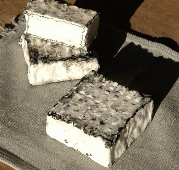 Llet pasteuritzada de cabra, pasta tova quallada làctica, de pell florida i recoberta amb carbó vegetal i