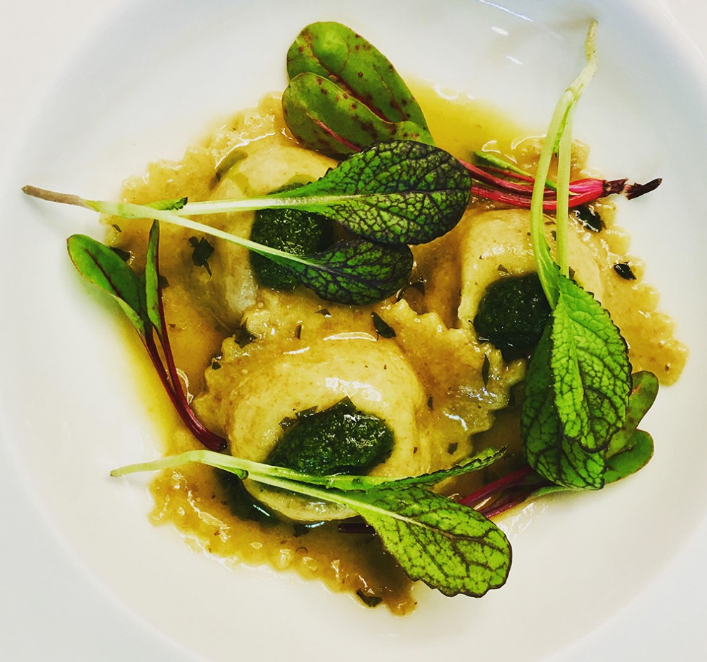 Raviolis de formatge almedroc, pera i pinyons amb salsa Juvert. Foto: Restaurant Sergi de Meià