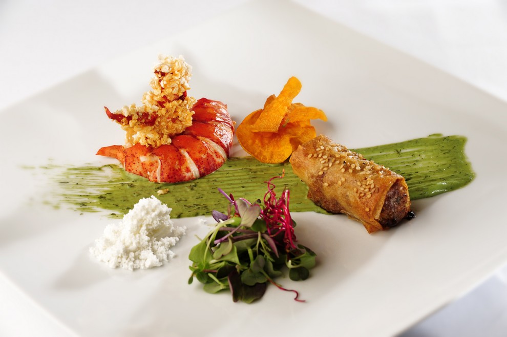 crema de gambes amb saltat de ceps i tronc d’escamarlà empanat amb pa d’estrella o l'espectacular i refrescant