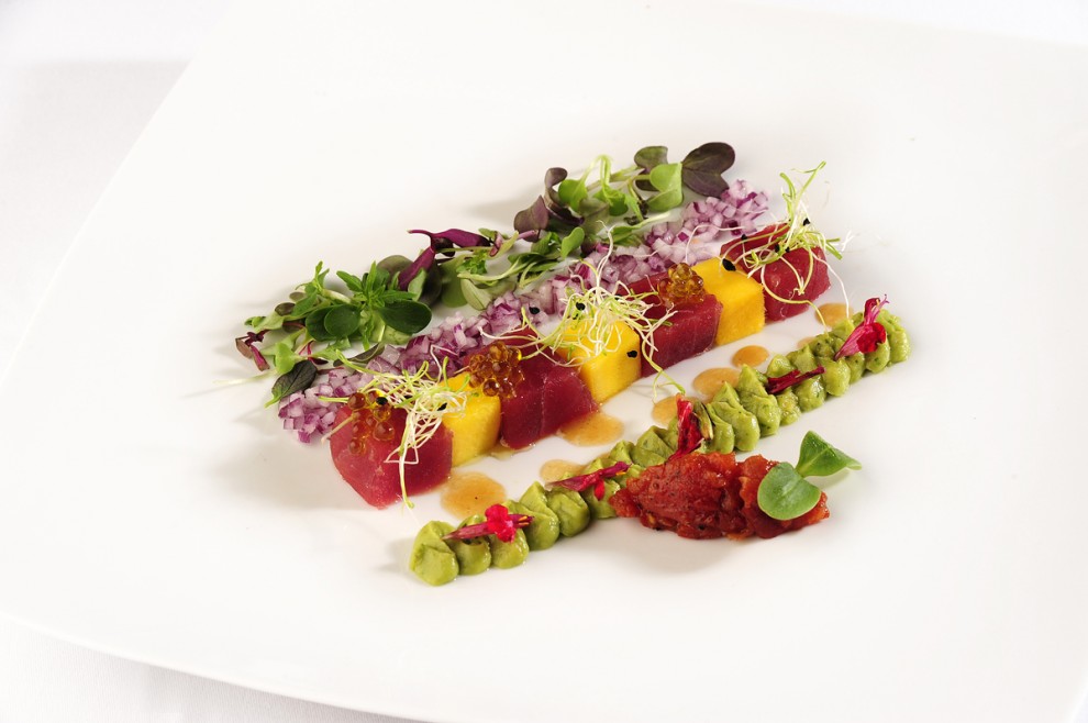 tonyina vermella marinada amb soja, gingebre i cítrics sobre mousse d’alvocat i ceviche de mango.