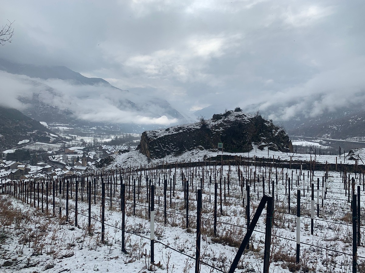 La vinya de Lo Bocoi d'Àneu a tocar d'Esterri nevada a l'hivern. Foto: Lo Bocoi d'Àneu