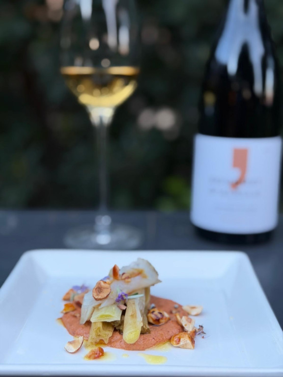 El maridatge: El vi aporta estructura tànica, notes rústiques, matisos umami i un punt salí que encaixa amb el conjunt. La seva acidesa neteja la greixositat del romesco i realça els tocs especiats, mentre que la seva textura acompanya la dolçor caramel·litzada dels fruits secs. Un perfecte equilibri entre fum, dolçor, salinitat i vegetal.