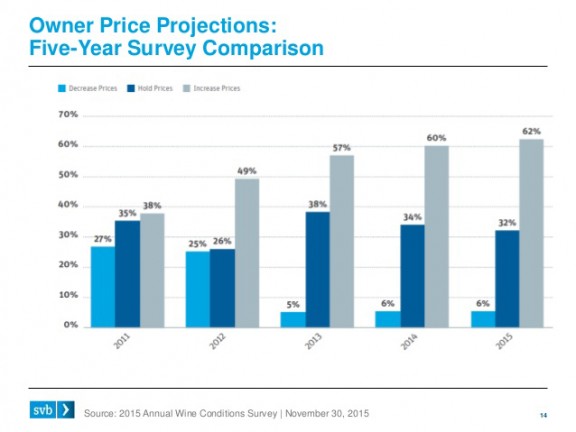 Així es preveu un increment del preu de l’ampolla d’entre un 4 i un 8% per vins amb un rang de preu per sobre dels $10 i, per contra, una caiguda en el volum de vendes i el preu dels vins de gamma més baixa (el preu de l’ampolla fixat a $8).