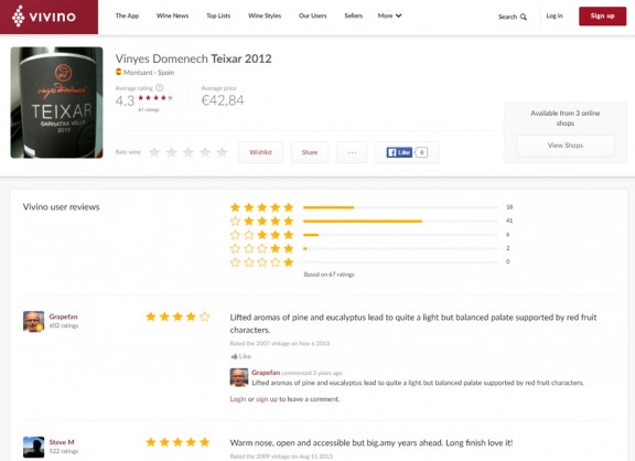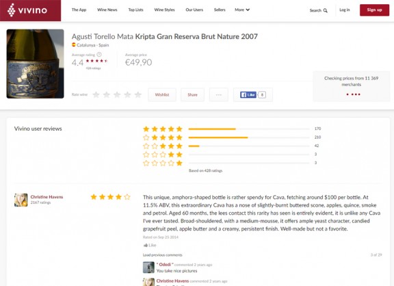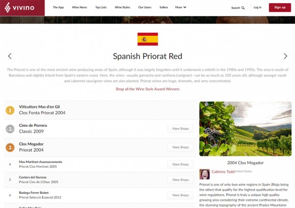 Vivino. Hi ha diverses categories representades on podem trobar aquests vins puntuats. N’hi ha que es distingeixen per la denominació d’origen, com Spanish Priorat Red (Vi Negre del Priorat), Spanish Montsant Red (Vi Negre del Montsant) o Spanish Cava (Cava Espanyol), i d’altres en què es distingeix la varietat, com Spanish Grenache (Garnatxa Espanyola).