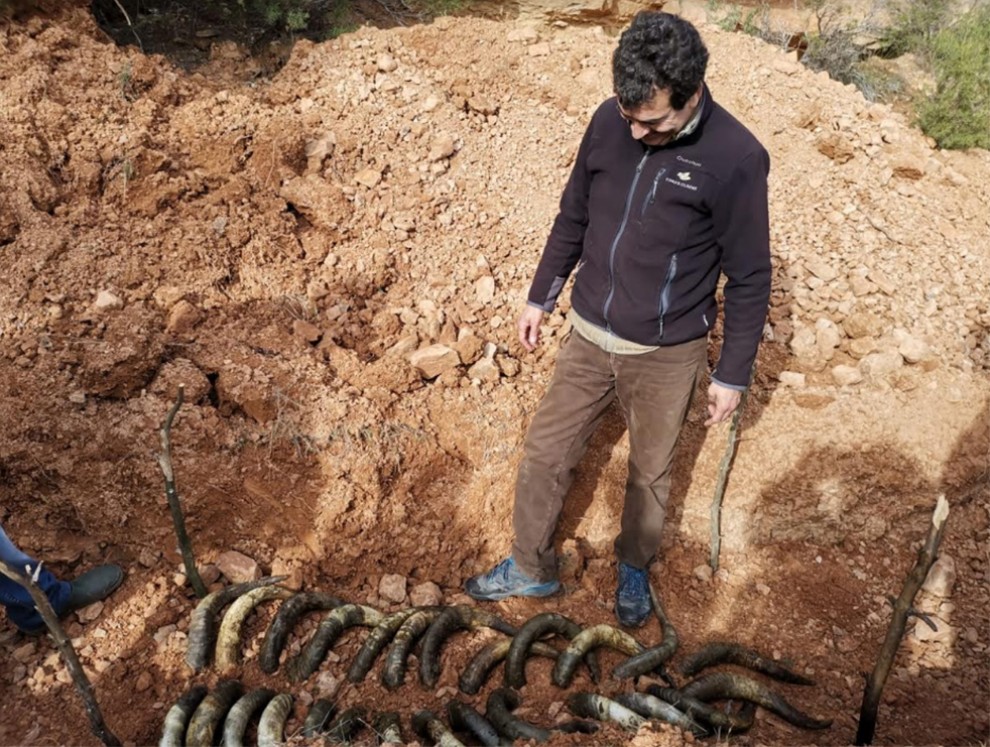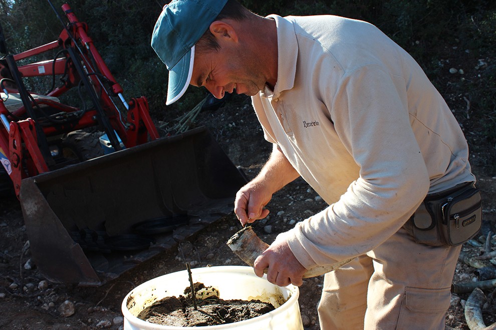 enterrar banyes de vaca farcides al camp per elaborar preparats de viticultura biodinàmica.