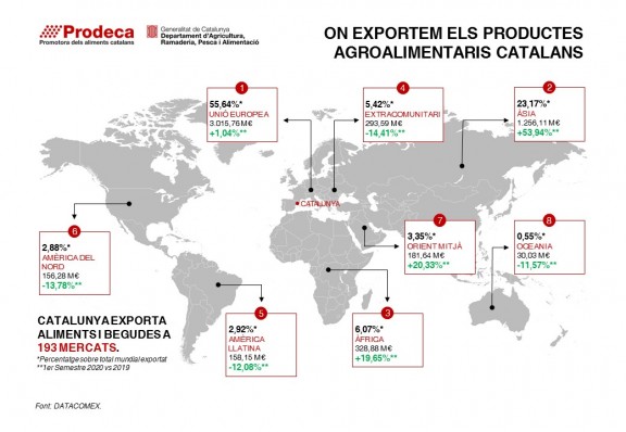 Catalunya va assolir per primera vegada el superàvit comercial agroalimentari durant el primer semestre del 2019 i el va consolidar en el global de tot l’any 2019. En aquest primer semestre de 2020 es manté el superàvit amb una taxa de cobertura del 112,94%, és a dir,