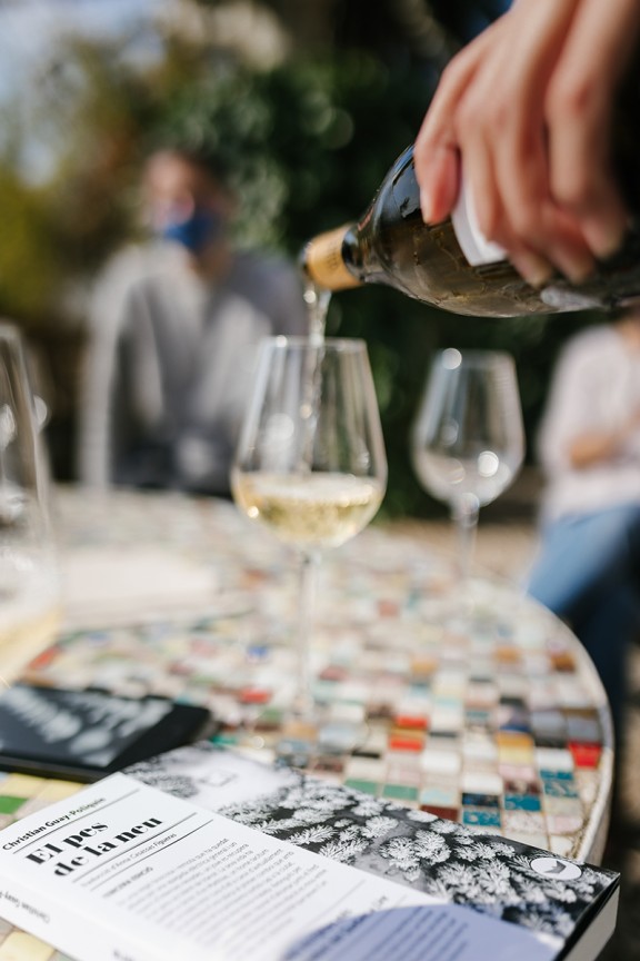 “Que beguin vi, que comprin llibres i que consumeixin cultura és un somni fet realitat”, sospira la Maria. Es una activitat que cura cos i ànima. A finals de març hi ha un especial de novel·la negra i a l’abril, el club de lectura regular. “No pensàvem sobreviure tants mesos”, insisteix l’Anna. Però el club de lectura no para de generar interès i s’ha convertit en la punta de llança per descobrir Mas Palou. A la setena edició, comparteixen taula a l’aire lliure una filòloga i fotògrafa, una periodista, una ballarina i actriu, una biòloga, una arquitecta… “Estem abonats a l’hedonisme”, solta amb un somriure l’Anna Vallès davant de la taula enrajolada de colors, plena de llibres, un e-book, vi i gastronomia.