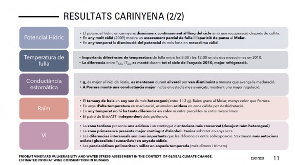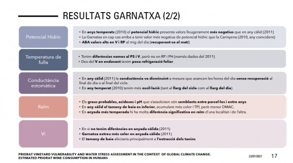 la garnatxa respondria a canvis ambientals més sobtats, evitant la pèrdua més eficient d’aigua (isohídrica) que la carinyena i que en anys molt càlids les dues varietats tendeixen a un tancament estomàtic i per tant al bloqueig metabòlic, per tant, hi ha una major vulnerabilitat davant de la sequera.