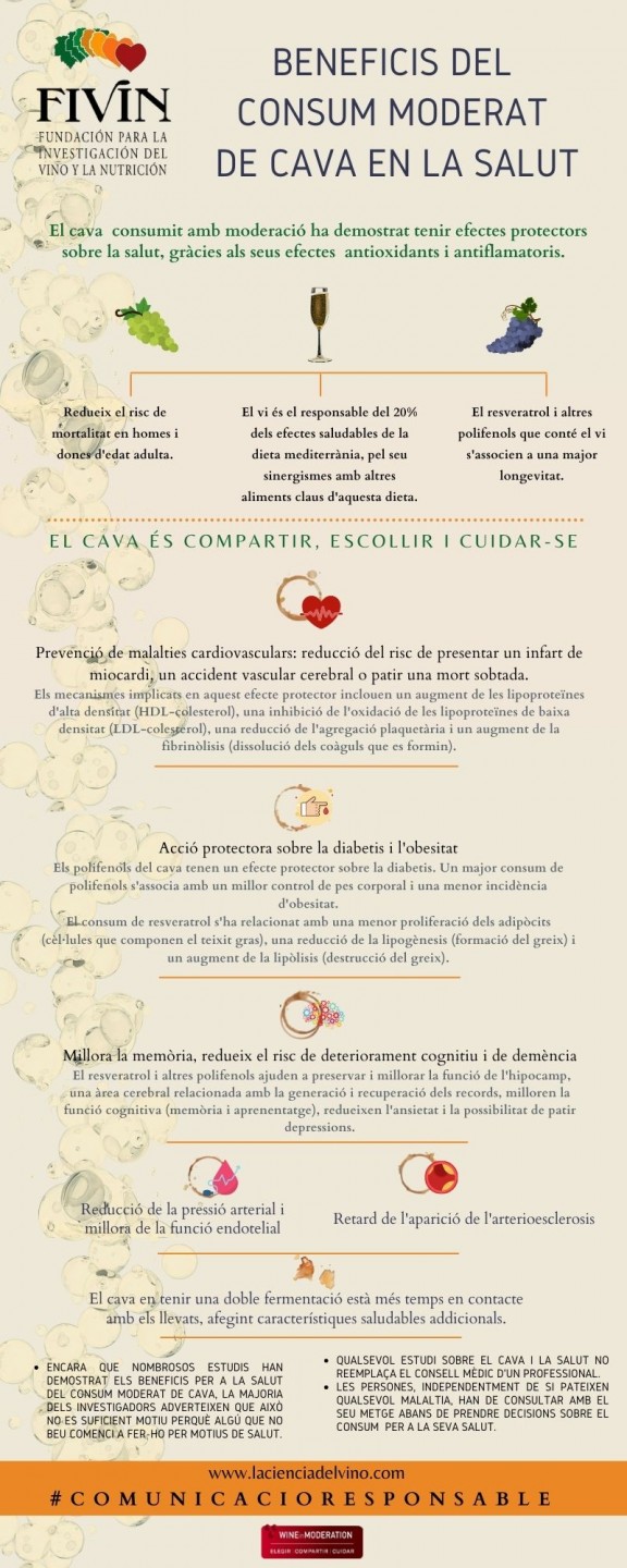 el consum moderat de cava pot resultar útil per a millorar els nostres factors de risc vascular i reduir el risc de patir una complicació cardiovascular. Part d'aquest efecte és degut a l'alcohol (etanol) que conté i una altra part al seu contingut en productes no alcohòlics, principalment polifenols.
