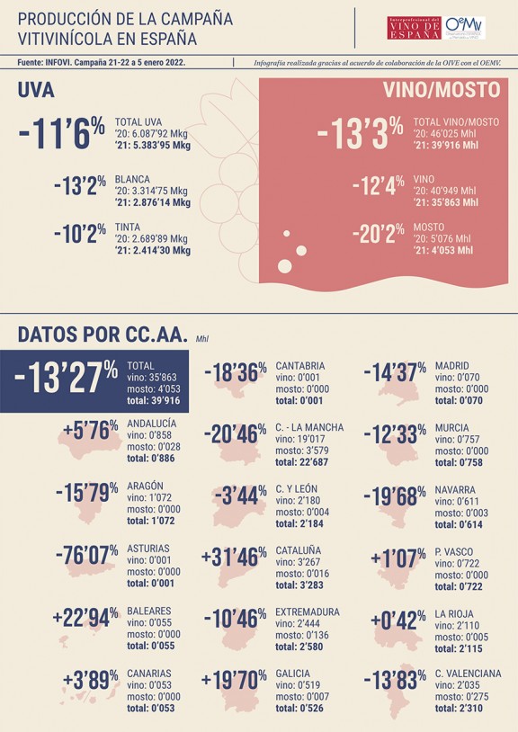 L'informe, elaborat per l'Observatori Espanyol del Mercat del Vi (OeMV) per a OIVE, es basa en les dades que mensualment declaren tots els operadors al sistema INFOVI. En aquesta ocasió, amb dades novembre 2021, es recullen també les declaracions dels productors de menys de 1.000 hl, cosa que dóna més precisió a l'anàlisi.