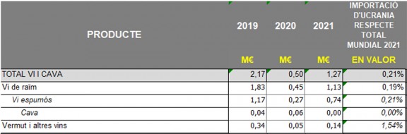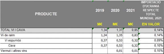 el 2021 el sector va exportar a Ucraïna per valor de 2,38 milions d'euros. Tanmateix, Rússia i Bielorússia van importar el darrer any vins i caves catalans per valor d'