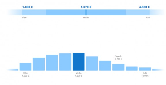 1.670 € nets per mes (al voltant de 30.800 € bruts per any). Això és un sou uns 6.700 € més alt que el salari mitjà anual d'Espanya, concretament un 28% més de salari. La forquilla, evidentment, pot variar i pot començar en un salari mínim de