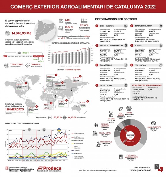 Catalunya ha superat per primera vegada els 14.000 milions d’euros en les seves exportacions (14.848,94 M€), augmentant un 15,30% en valor en comparació amb les dades de 2021. El decreixement en volum (-4,23%) respon a l’impacte de la baixa producció del sector de la fruita i horta (a causa de factors climatològics) i dels cereals i molineria (directament afectats pel conflicte d’Ucraïna i usats aquest 2022 per autoconsum).