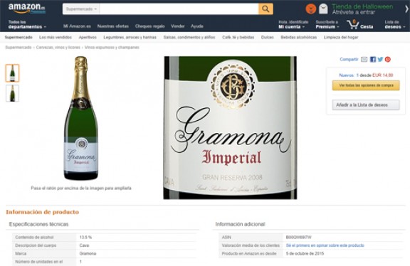 supermercat d'Amazon a Espanya ens mostra ja el vi d'una manera molt destacada, al seu apartat de "cerveses, vins i licors". En total, 514, referències.