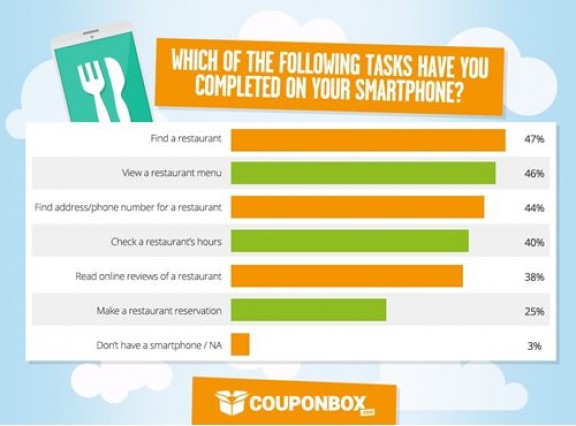 RetailMeNot realitzat a la població d'Estats Units, el 53% dels enquestats havia buscat el restaurant mitjançant el mòbil, i el 49% havia navegat pel menú del restaurant a través del telèfon intel·ligent per conèixer els seus plats abans d'anar-hi, i només el 21% no havia utilitzat el mòbil per fer cap d'aquestes accions.