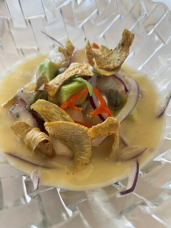 "Cebiche de dorada salvaje, vieiras y pulpo con leche de tigre de alcachofa".
