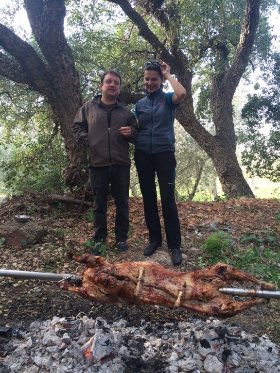 La barbacoa rústica consisteix en un dinar entre vinyes a base de xai lletó. El xai es cou sencer a “l’estil rústic” o de manera tradicional a la brasa, fent servir fusta i carbó. Veure el rostit del xai és una experiència en si mateixa pels visitants, els quals fan també una visita dirigida al celler i un tast de vins i caves abans del dinar.