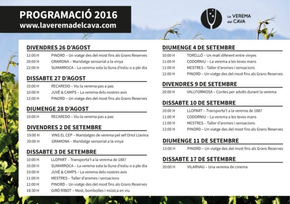 Les propostes enoturístiques engloben un ampli ventall d’activitats: des de concerts amb música en viu fins a projeccions de cinema entre vinyes, passant per tallers d’aromes, esmorzars de pagès, passeigs amb llanternes sota la lluna d’estiu, lectures de contes per adults o viatges amb carruatges per entendre com vivien la verema els nostres avis. Els divendres, dissabtes i diumenges, els tretze emblemàtics cellers obriran les seves portes per acollir aquells que vulguin gaudir d’una experiència en un entorn singular.