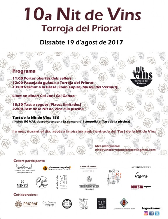 Per cloure el matí, hi haurà una vermutada popular a la plaça de la Bassa amb la col·laboració del Museu del Vermut de Reus. Joan Tàpias, del Museu del Vermut, explicarà algunes curiositats sobre el vermut i com s’elabora aquest producte. Per la tarda es podrà assistir a un tast popular dirigit i amb l’entrada del Tast de la Nit de Vins es podrà accedir a la piscina durant tot el dia. Finalment, per cloure la diada, hi haurà el tast de la Nit de Vins a la piscina, que com cada any, començarà a partir de les 22h i on es podran tastar els vins de tots els cellers participants. La vetllada estarà ambientada pel DJ Golfo de Guinea i comptarà amb la presència dels cellers convidats, AV Bodeguers, Vins de Foresta i Celler Frisach.
