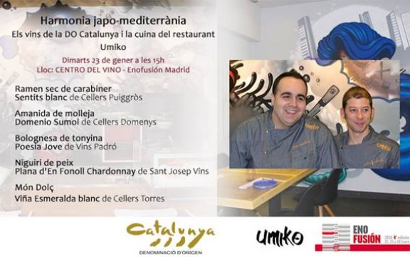 Del 22 al 24 de gener, la Denominació d’Origen Catalunya es trasllada a Madrid per participar en la vuitena edició d’Enofusión, el Congrés Internacional del Vi que se celebra en el marc del cim Madrid Fusión al Palacio Municipal de Congresos. L’acte principal de la DO Catalunya tornarà a ser, un any més, una proposta de maridatge-fusió que, enguany, buscarà la unió entre el Mediterrani i el Japó de la mà del restaurant Umiko i la seva cuina japonesa fusió.
