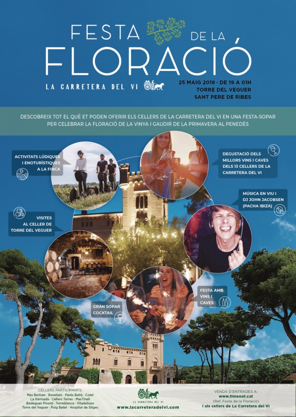 divendres, 25 de maig, la Carretera del Vi estrena la primera edició de La Festa de la Floració, un esdeveniment on descobrir tot el què pot oferir la ruta, a través d’una gran mostra enoturística dels 13 cellers que conformen la wine road, seguida d’un sopar i un final de festa amb música en directe i DJ’s als jardins del celler familiar Torre del Veguer de Sant Pere de Ribes.