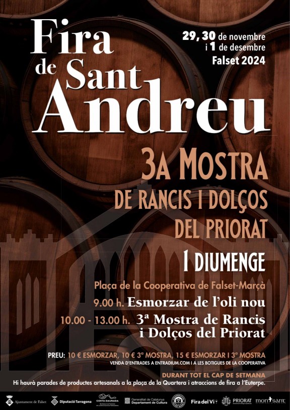 Context: La Fira de Sant Andreu de Falset és un esdeveniment amb una llarga tradició que combina la venda de productes artesanals, activitats lúdiques i, des de fa tres anys, la Mostra de Vins Rancis i Dolços del Priorat. Aquesta mostra posa en valor aquests vins emblemàtics del territori, produïts per cellers de la DO Montsant i la DOQ Priorat, i per altres elaboradors locals.