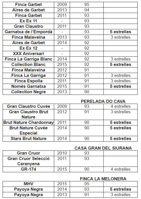 Entre els caves, la nota més alta l’aconsegueix el Gran Claustro Cuvée 2009 (93 punts), i també tres caves Perelada obtenen 5 estrelles per la seva excel·lent relació qualitat-preu, tots ells amb 90 punts: Brut Nature Chardonnay 2011, Brut Nature Cuvée Especial 2014 i Stars Brut Nature 2014.