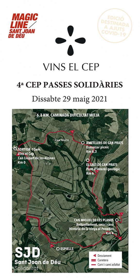 A mig camí es farà una parada per esmorzar, degustar cava i vi i acabar amb un dinar entre vinyes al celler Vins El Cep. Aquesta experiència es transformarà en suport (amb el 50% del recaptat) per la Magic Line, la caminada i la mobilització solidària de Sant Joan de Déu que neix amb la voluntat d’ajudar i acompanyar a qui més ho necessita.