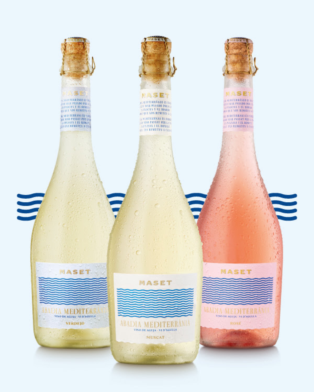 La gamma Abadia Mediterrània es presenta en ampolla Donna, característica de vins escumosos, amb una etiqueta que evoca motius marítims, i amb el tap vist, donant protagonisme al suro.