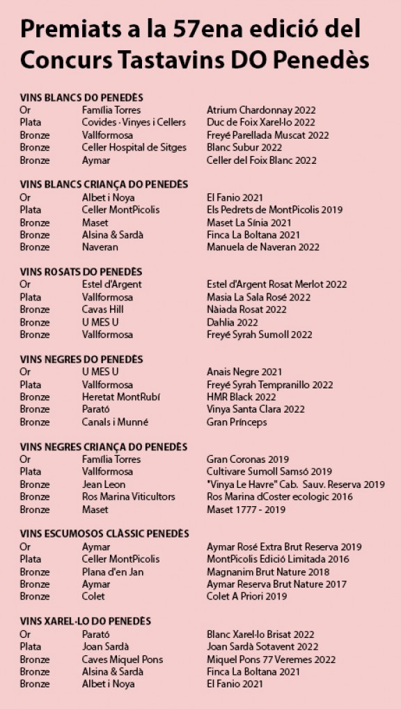 El Concurs Tastavins DO Penedès 2023 es va decidir el passat 24 d’abril a l’edifici de l’Enològica de Vilafranca del Penedès, on trenta tastadors; enòlegs, sommeliers, periodistes especialitzats i representants de botigues i distribuïdores especialitzades, van tastar i puntar a cegues els millors vins del Penedès.