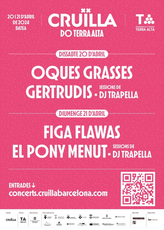 El dissabte 20, juntament amb Oques Grasses, Cruïlla DO Terra Alta acollirà l’actuació de Gertrudis, que celebra els 20 anys del seu debut. Diumenge, igual que l’any passat, serà el dia per a tota la família, amb l’actuació del Pony Menut, la versió per als més petits del Pony Pisador, que compartiran escenari amb el duet Figa Flawas.